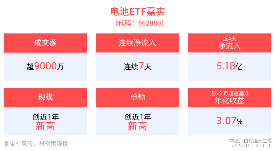 4.点击进入全固态电池正迈向产业化导入阶段,电池ETF嘉实(562880)连续7天净流入截至2025年10月13日 11:20,中证电池主题指数下跌2.23%,多氟多领涨7.55%,天赐材料上涨4.53%,湖南裕能上涨3.71%;南网科技领跌,三花智控、科达利跟跌。电池ETF嘉实(562880)下修调整。,打开选关界面。